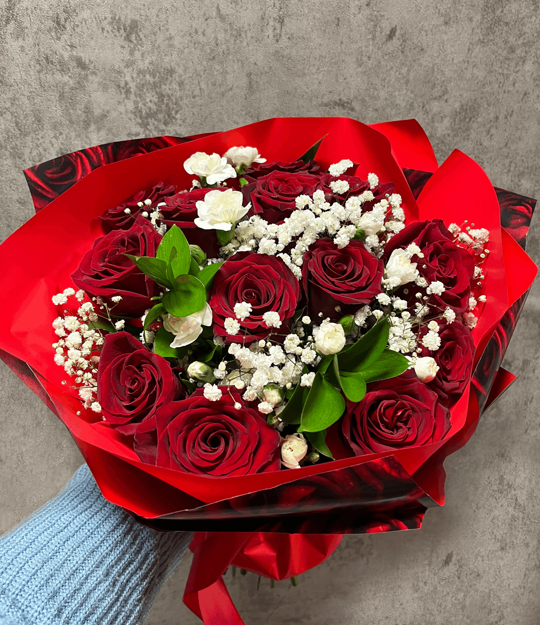 Bukiet skomponowany z czerwonych róż z eustomą wraz z dodatkami zieleni.