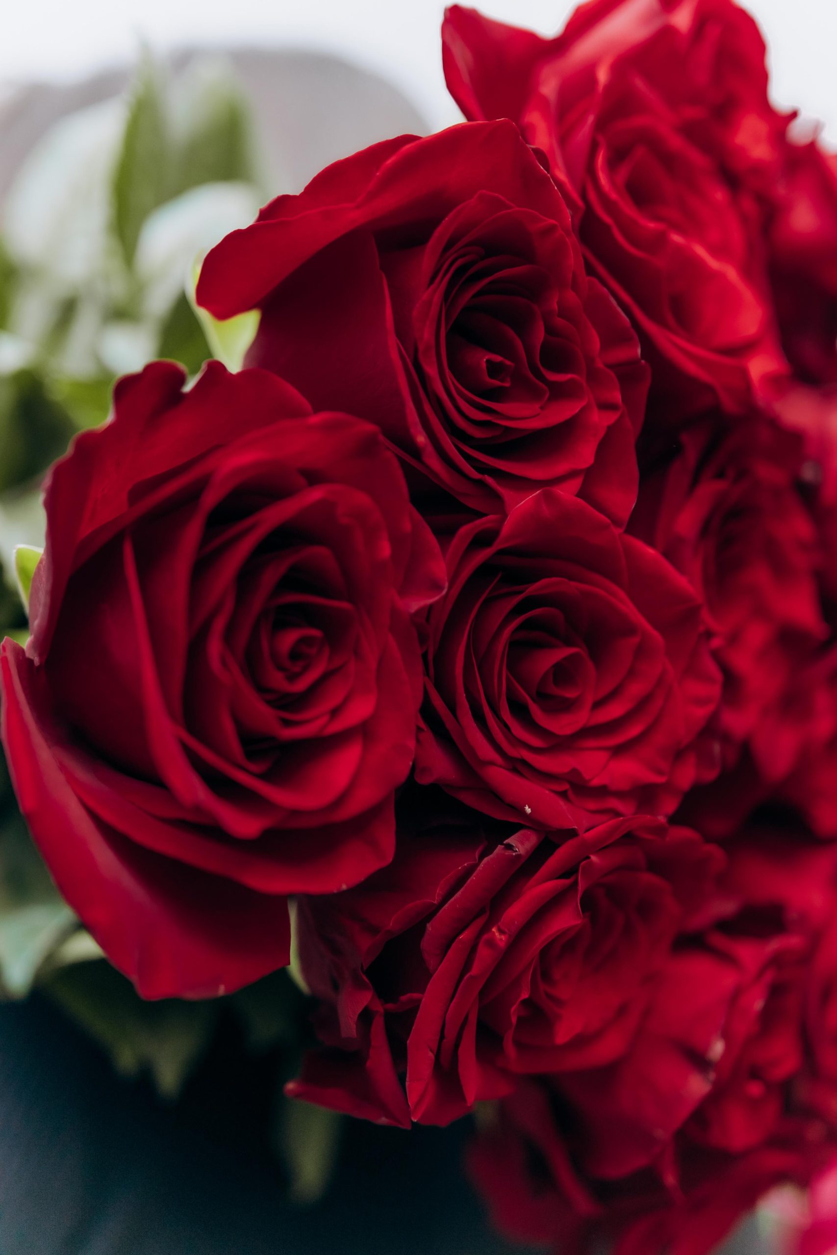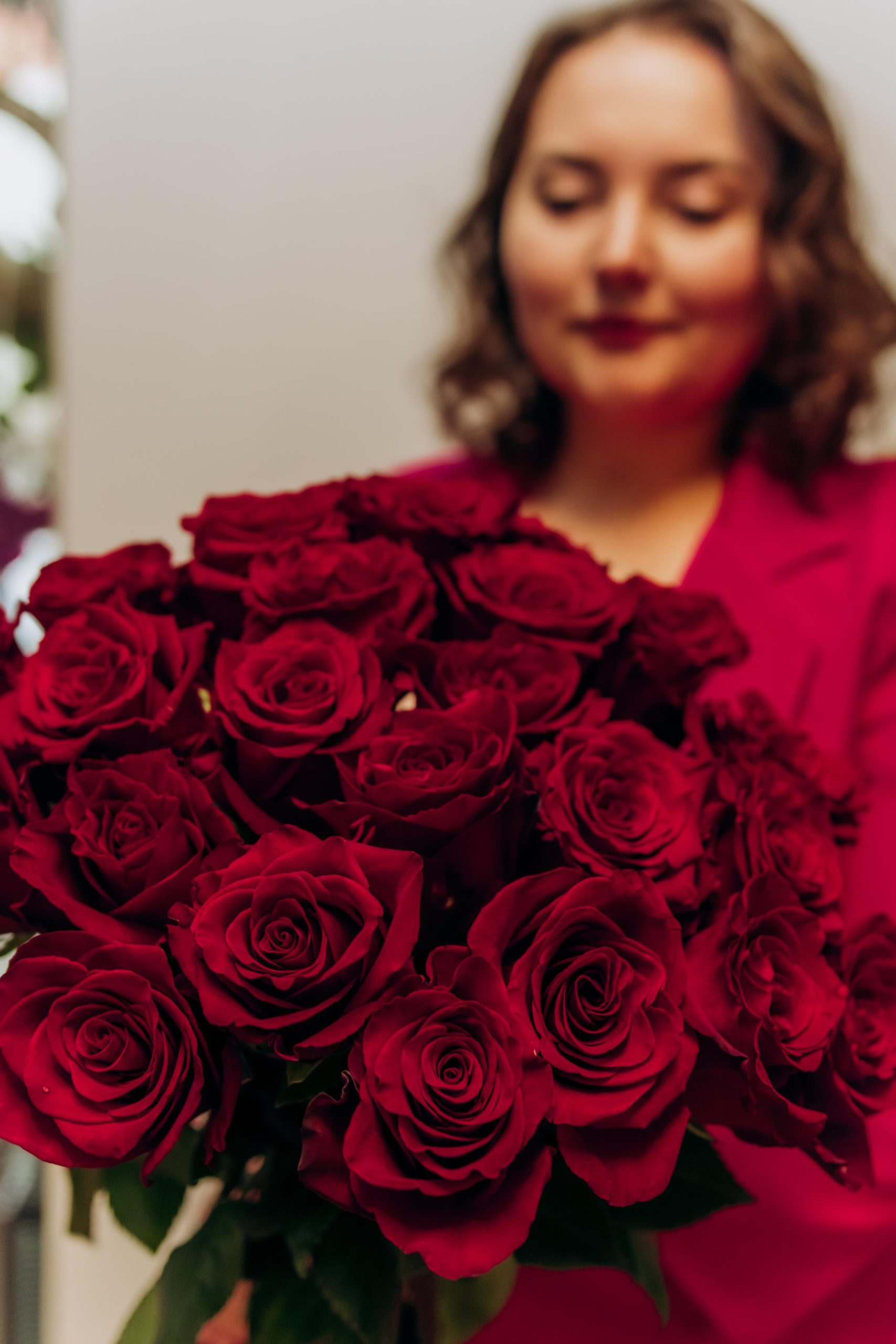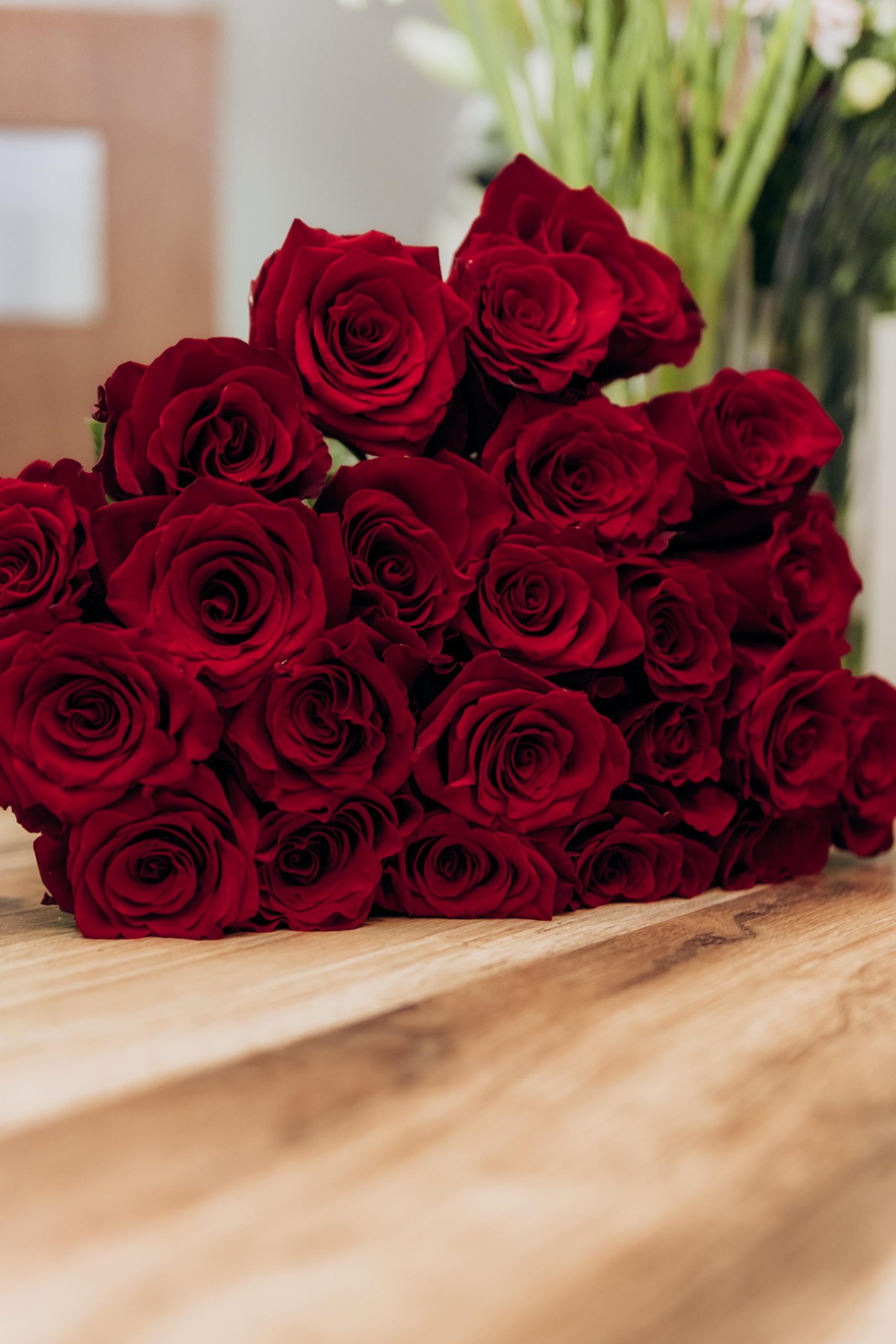 Elegancki bukiet skomponowany z dużych, głęboko czerwonych róż o pełnych, klasycznych kwiatach. Starannie ułożony, tworzy efektowną, harmonijną kompozycję idealną na wyjątkowe okazje.