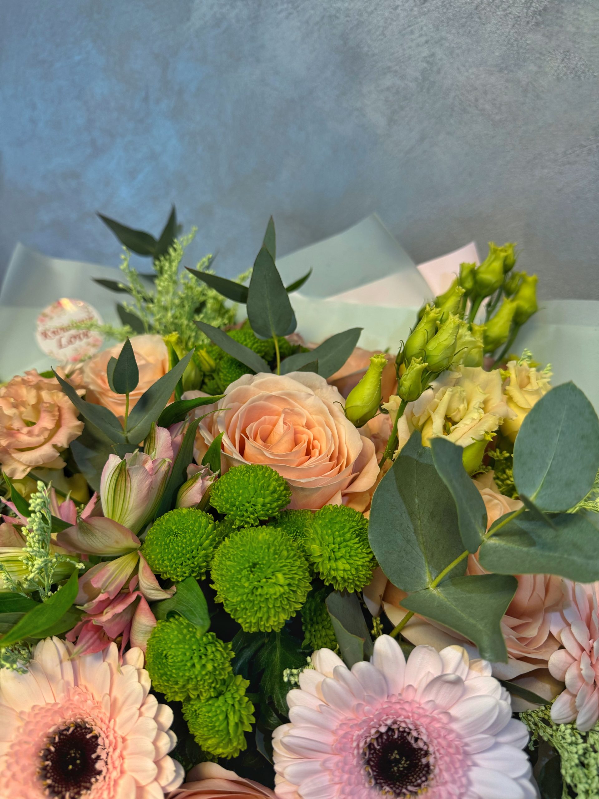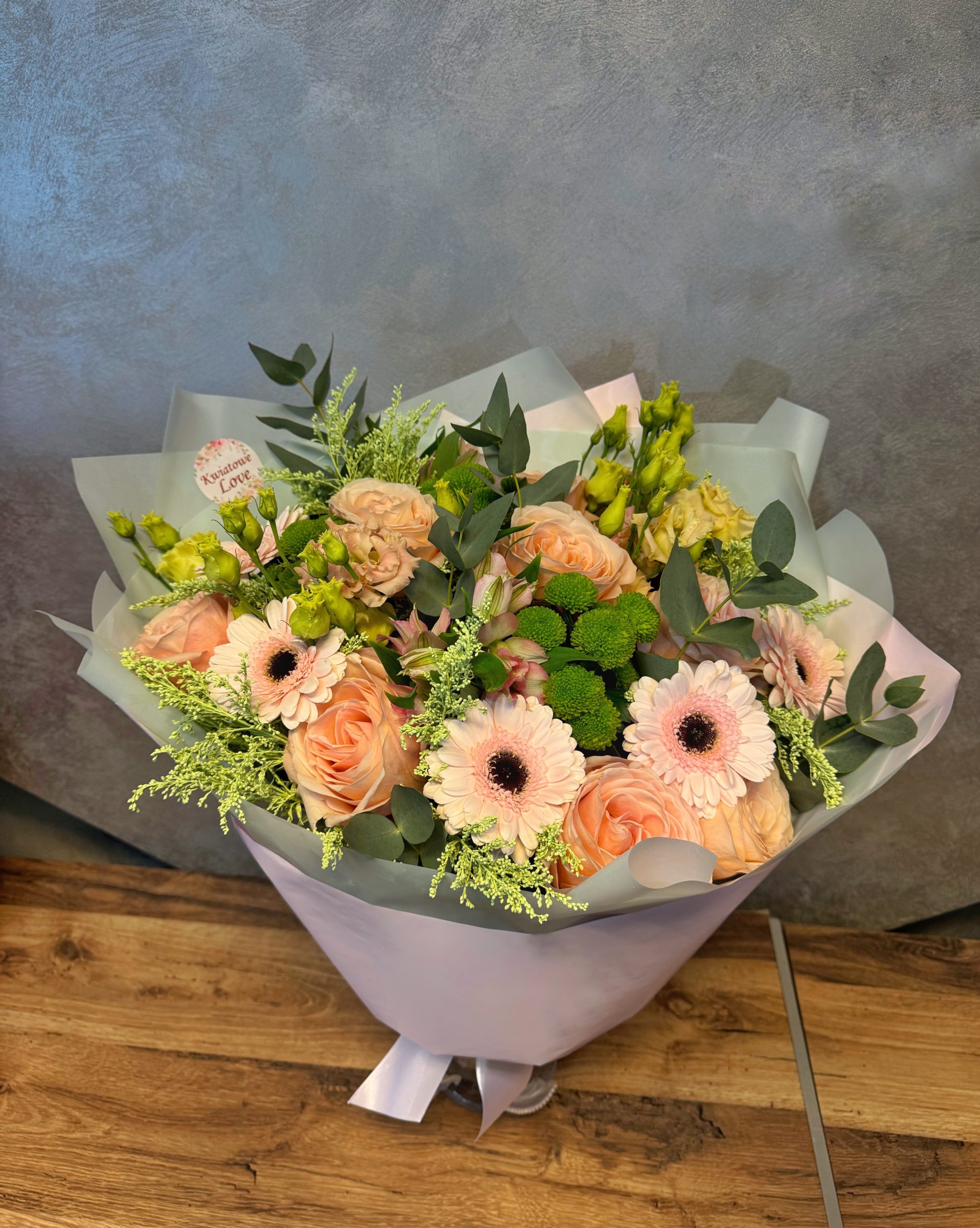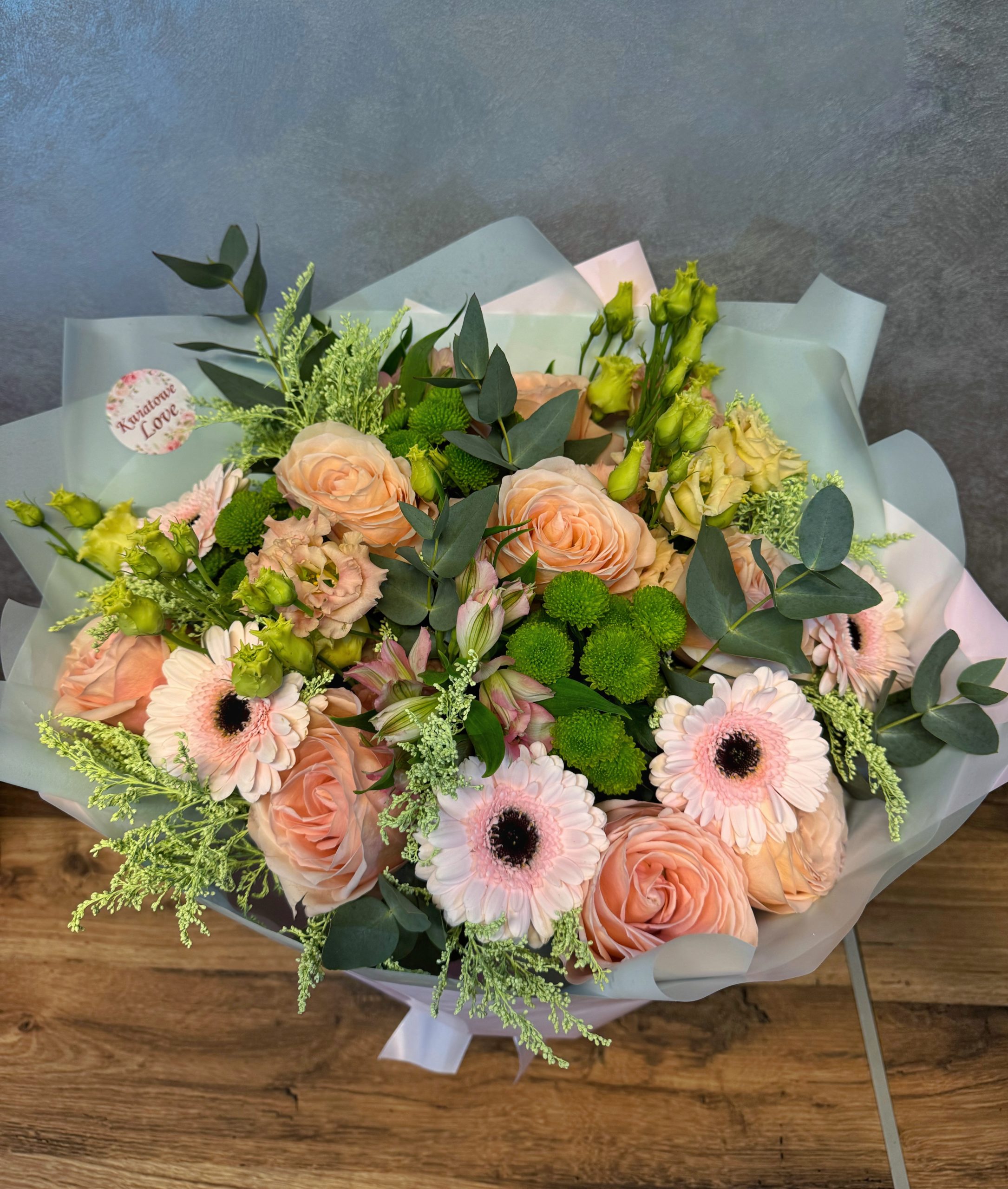 Bukiet skomponowany z beżowych róż, jasnoróżowych gerber, zielonych santini, różowej alstromerii oraz eustomy. Kompozycję uzupełnia jasnozielone solidago lub inne dodatki sezonowe w tym kolorze oraz eukaliptus. Całość ułożona w jasnym papierze dekoracyjnym i wykończona dopasowaną kokardką.