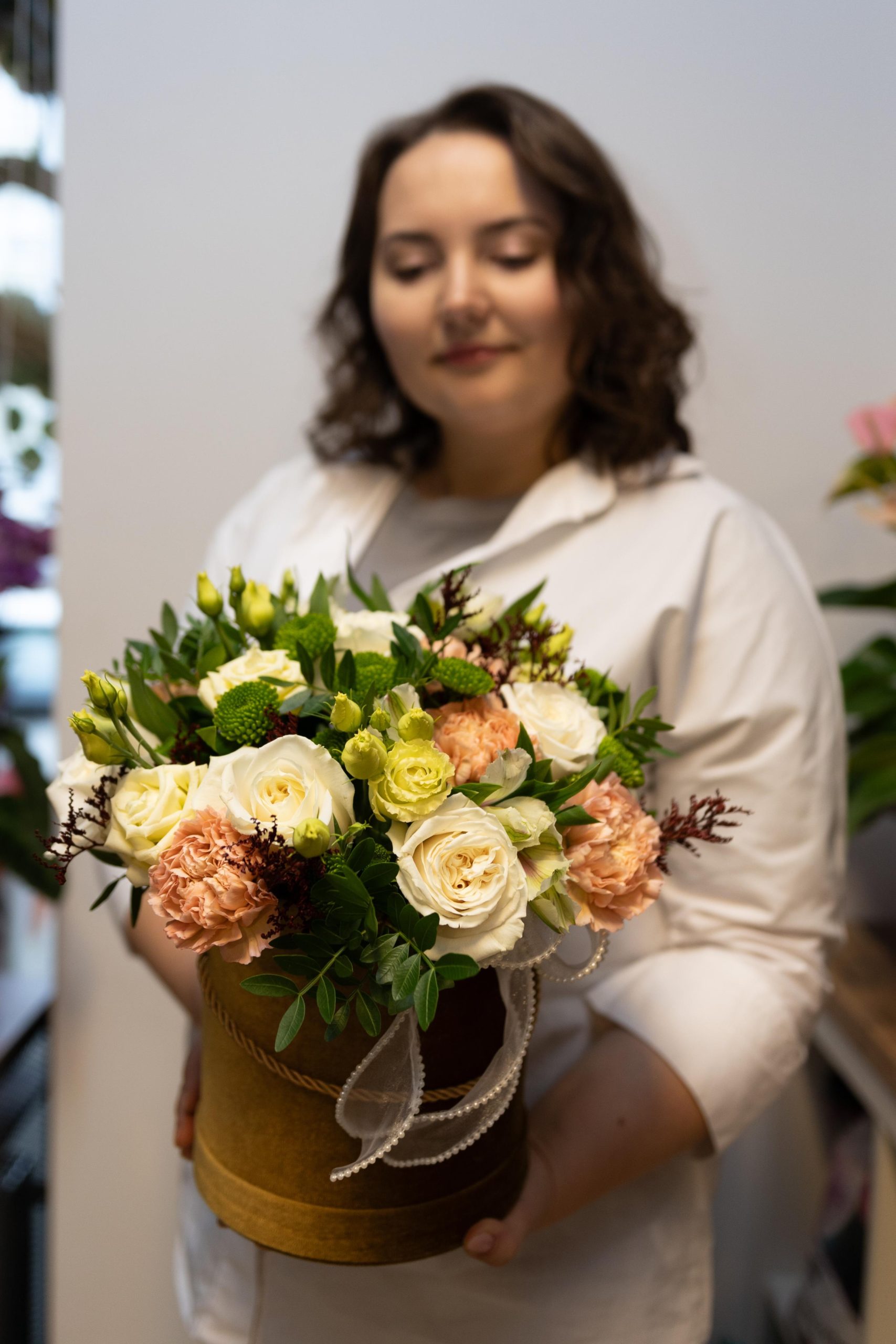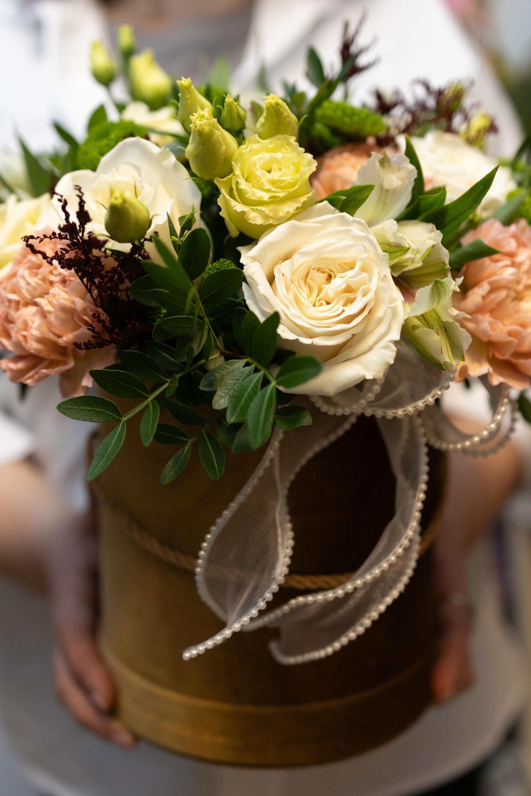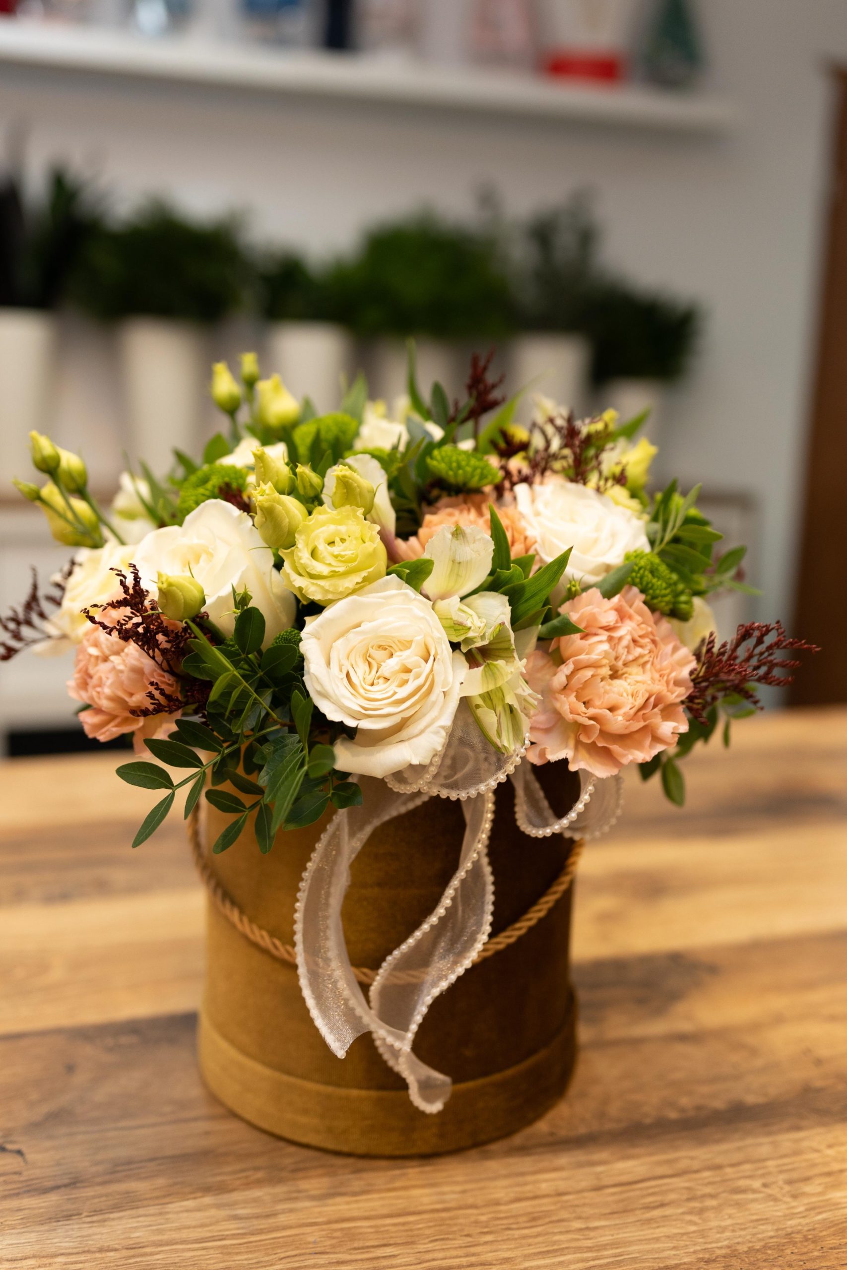 Kompozycja skomponowana z białych róż, zielonych santini, beżowych goździków, kremowej/jasnoróżowej eustomy, białej alstromerii oraz bordowego limonium lub innych dodatków sezonowych. Całość dopełnia zieleń pistacji. Kompozycja została ułożona w eleganckim pudełku i wykończona dopasowaną kokardką.