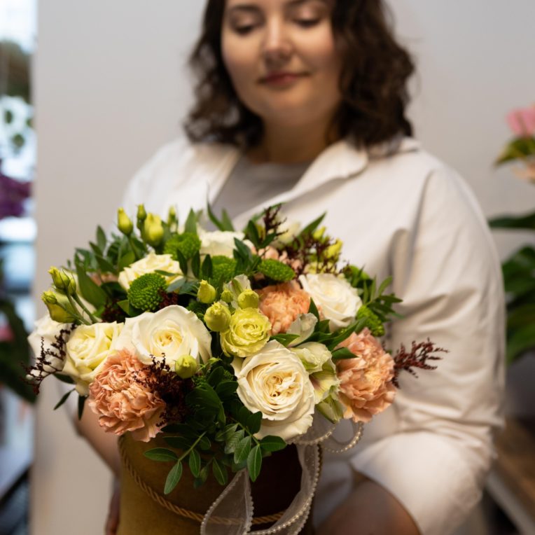 Odcienie kwiatów oraz dodatki mogą się nieznacznie różnić w zależności od dostępności sezonowej. Kolor flowerboxa może delikatnie odbiegać od prezentowanego na zdjęciu.