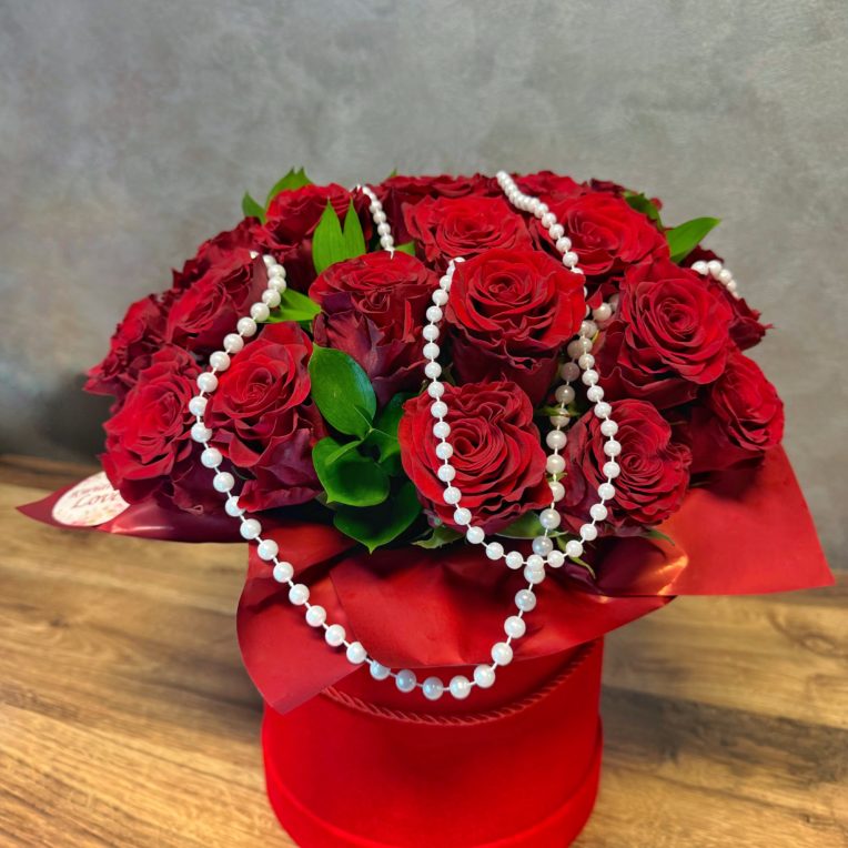 Flowerbox w pastelowo-czerwonej kolorystyce, łączący jasnoróżowe i czerwone róże z alstromerią, goździkami oraz eustomą. Kompozycja uzupełniona delikatnymi dodatkami sezonowymi, zielonym eukaliptusem, tworzy elegancką i spójną całość. Kwiaty umieszczone są w jasnoróżowym flowerboxie, który podkreśla subtelny charakter aranżacji.