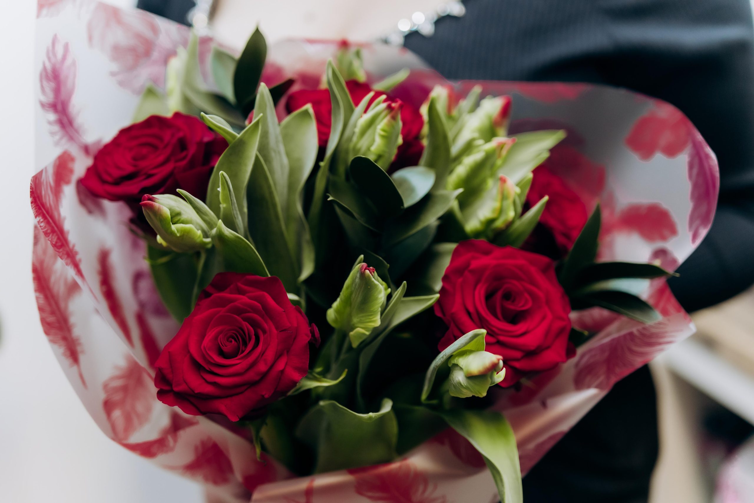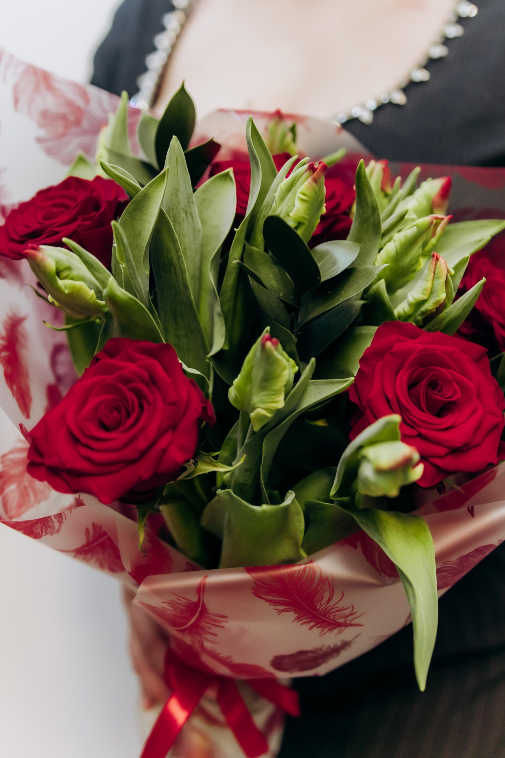 Bukiet skomponowany z 5 czerwonych róż, 10 czerwonych tulipanów oraz ruskusu, ułożony w dekoracyjnym papierze i wykończony czerwoną wstążką.